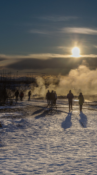 Die schwarz-weiß Landschaft aus Schnee, Eis und Lavagestein wird unterbrochen durch dampfende Säulen, die ein Heißquellengebiet ankündigen. Imposant gefrorene Wasserfälle liegen ebenso auf unserer Route wie schwarze Strände mit Basaltsäulen, Gletscherzungen und historische Orte. Auch das heiße Bad unter freiem Himmel fehlt nicht und der Besuch in einem Tomatengewächshaus, welches mit Geothermie beheizt wird.