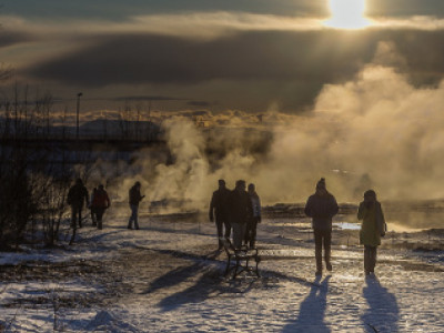Auf dem Weg besuchen wir den farbenfroh leuchtenden Kerid Krater und Hveragerdi, das bekannt ist für seine "Green houses" - mit Geothermie beheizte Gewächshäuser. Hier dampft die Erde überall. Wir wandern entlang eines heißen Flusses (ca. 2 Stunden, 150 Höhenmeter, kann rutschig sein). Und hier gibt es das weltweit einzige geo-thermisch gebraute Bier.