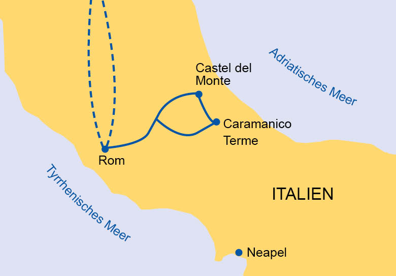 - Transfers (Kleinbus/PKW) Rom – Caramánico Terme; Caramánico Terme – Castel del Monte und Castel del Monte – Rom