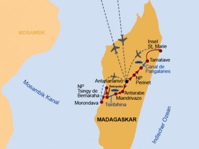 Diese Spezialreise nach Madagaskar erschließt Dir mehrere fantastische Regionen: Zunächst den relativ selten besuchten Westen durch eine zweitägige Flussfahrt auf dem Tsiribihina, der anschließenden Erkundung der Tsingy von Bemaraha und der Baobab-Region um Morondava. Dann erforschst Du die Regenwaldzone der Ostküste im Bereich des Nationalparks von Perinet und der Fluss- und Seenlandschaft der Pangalanes. Als lohnenden Abschluss und sicher ein weiterer Höhepunkt erlebst Du dann auf der Pirateninsel von Sainte Marie: Traumstrand, Traumsand, Trauminsel!